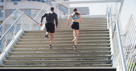Outdoor running mature couple. Man and woman of 40 years old running upstairs, view from the back.