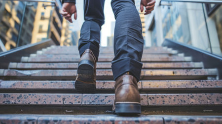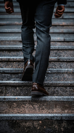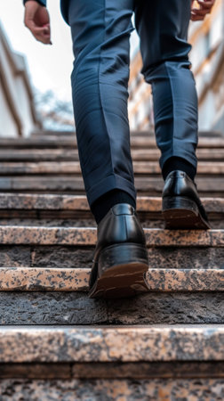 View of a business professional taking steps upward in smart black Oxford shoes, embodied ambition on a stone staircase.