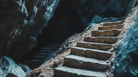 Explore the enchanting atmosphere of a cave interior featuring rugged stone stairs that lead deeper into the mysterious darkness, inviting adventure and discovery.
