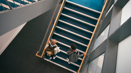 Two Male Secondary Or High School Pupils Inside School Building On Stairs Going To Lesson