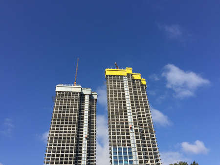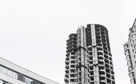 View of a modern complex of unfinished monolithic concrete buildings against the sky. Global urban development concept. Copy space