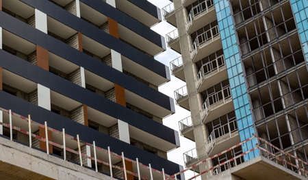 Fragment of the facade of a modern building under construction. Close-up on a multi-storey residential building under construction. The walls of the house in the process of work and architecture.