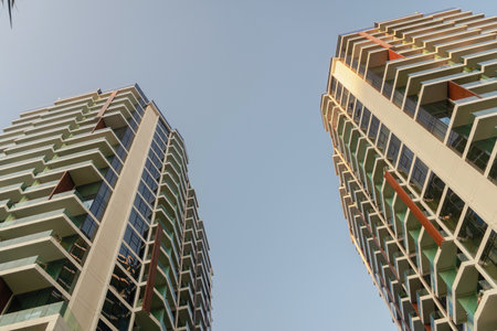 A stunning view of modern twin towers framed by a clear blue sky, showing casing architectural brilliance.