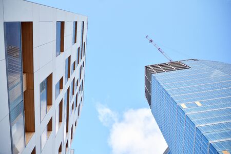 Bottom view of modern skyscrapers in business district against blue sky