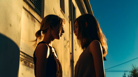 Two women standing next to each other in front of building with sky background. Generative AI.
