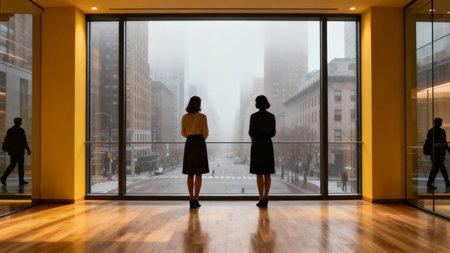 Silhouette of two business women looking at the city through the window
