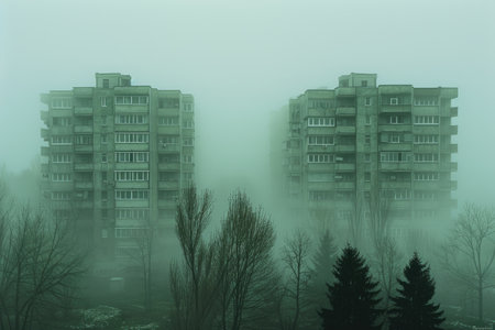 polluted city with shrouded in fog urban building background professional photography