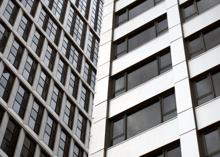 Facade detail of a modern high-rise apartment building. Abstract Architectural Detail of a High Rise Condo Building. Street photo, nobody, selective focus