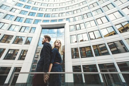 two confident young leaders on the background of an office building
