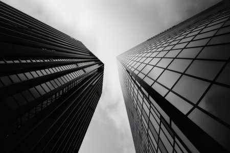 Two towering skyscrapers reaching into a cloudy sky.