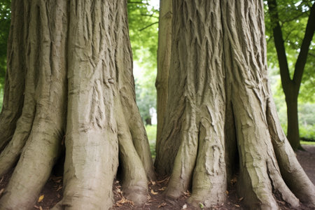 Two large trees stand prominently, their branches intertwined against a sunlit sky. The image captures the trees' textured bark and the intricate patterns of their foliage. The composition showcases the natural light and shadow play. This image is suitable for a wide variety of designs.