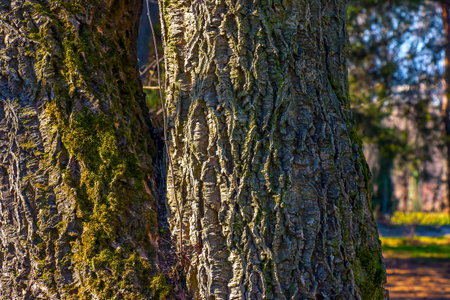 Blurry background with textured bark on tree trunk made in free lensing (lens whacking) technique. For wallpaper, background