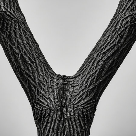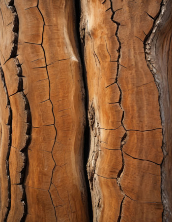Monochromatic detail focusing on the rough, deeply fissured bark texture at the intersection of two