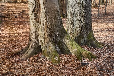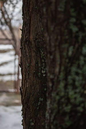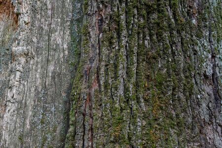 The texture of the bark of a tree made of two pieces. Due to the high humidity, the tree is covered with moss. Textured natural background with space to copy. High quality photo