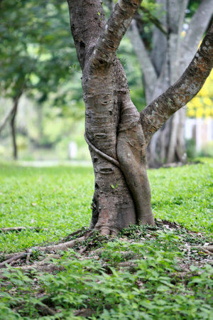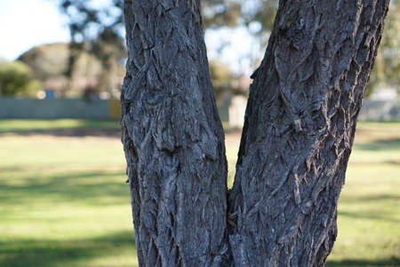 Closeup rough tree trunk with blurry green grass field in the backdrop