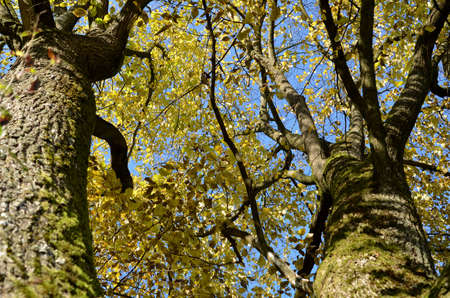 Two unusual trees against the background of the northern autumn forest. The branch has grown into the trunk. A beautiful and unusual effect like the human body. Golden autumn and leaf fall in late October.
