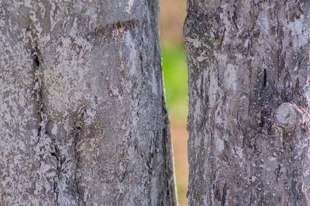Tree trunk texture of open bark showing naked tree with blurred green forest background