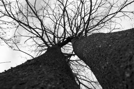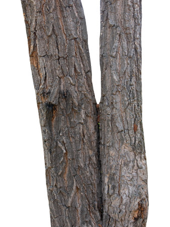 Fragment of the trunks of two old fir trees accreted together, with pruned branches, view close-up in overcast day