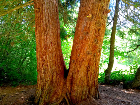 Featuring a close up of the trunks and bark of two pine trees in an open forest, redwood tree trunks with deep textures, brown grasses, green foliage, detailed photography in natural light, high resolution stock photography.