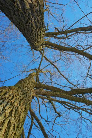 Two Trees Against a Blue Cloudy Sky. copy space. In the Park.