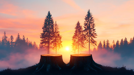 Two ancient, massive tree stumps with new growth on top stand in a clearing.