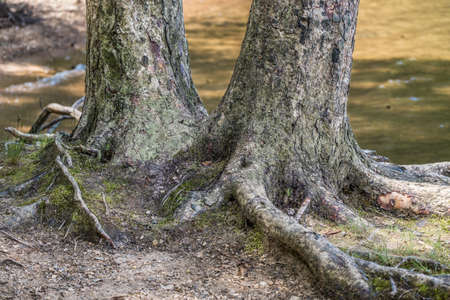 Partial view closeup of two trees with exposed roots merging together at the base at the edge of the shoreline at the lake