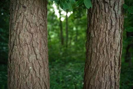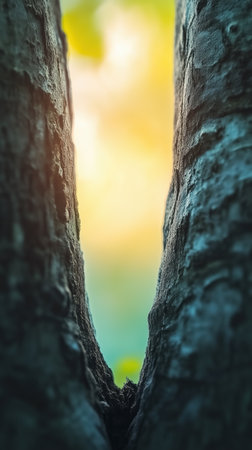Sunlight beautifully streams through the narrow split between the trunks of two trees in a tranquil forest setting. The warm hues create a peaceful and inviting atmosphere.