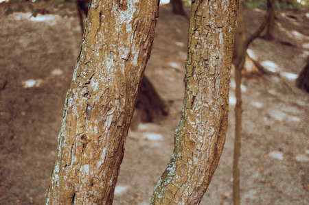 The beautiful curved trunks of pine trees with branches; selected focus in the forest