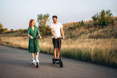 Young happy smiling couple having fun driving electric scooter on the road in the countryside. Content technologies.