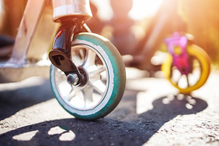 Electric Scooter wheels on a city pavement - Ride Sharing and rentals
