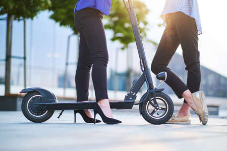 Two friends are chatting on the street at bright sunny day. One of them is rding electro scooter and wearing heels.