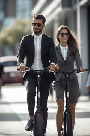 Generative AI : couple of young people are riding on the bike in the city center lifestyle concept