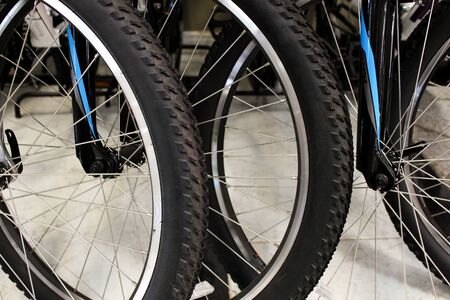 Close-up of electric bicycle wheels parked in an on-street parking lot