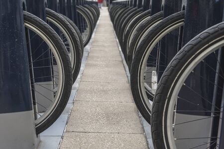 Bicycle rental on the city street. Ecological transport. Health and sports.