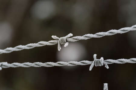 A striking close-up of weathered barbed wire, accentuated by a soft blue sky, creating a powerful visual representation of isolation and conflict in nature.