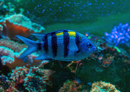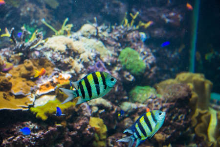Scissortail sergeant fish (Abudefduf sexfasciatus) striptailed damselfish underwater, Tropical waters, Marine life