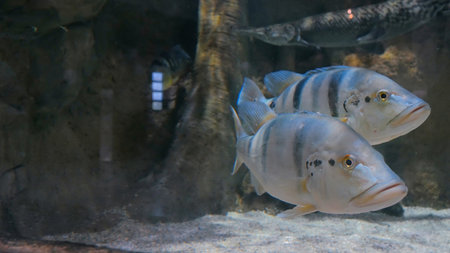 Fish from family boxfishes, female specimen of striped Aracana aurita, living in aquarium. Inhabits the waters of the Indian and Pacific Oceans at depths of 100-200 meters and more.