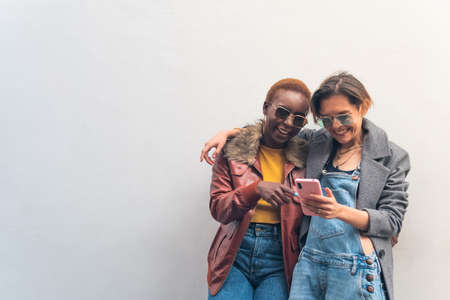 two multi ethnic friends looking a message on a smart phone in the street and smiling with a white wall in the background. High quality photo