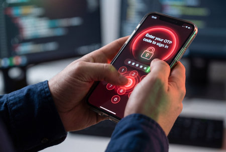 Male hands holding a mobile phone and entering a security code on a red digital interface to access an account while sitting near computer monitors displaying software code.
