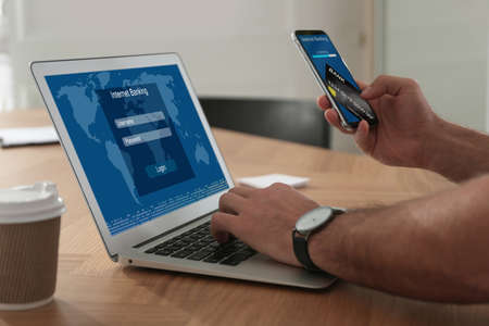 Man using online banking application on laptop and smartphone at wooden table, closeup