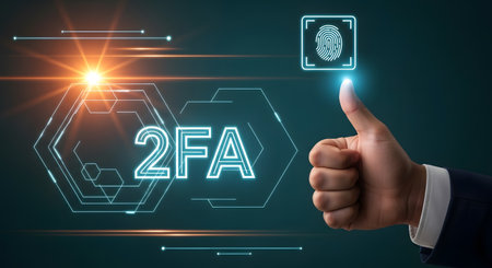 Two-factor authentication (2FA): user confirms identity with fingerprint and OTP on smartphone while signing into laptop. Secure login, cybersecurity, data protection and privacy in modern workspace.