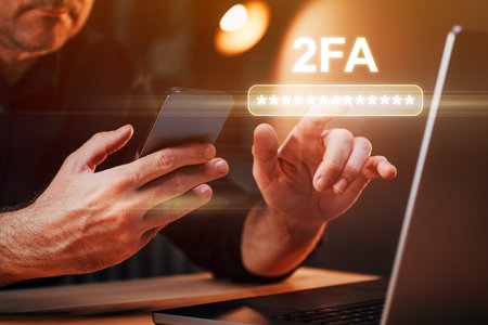 Two factor authentication 2FA, businessman using mobile phone and laptop to sign in to online account, selective focus