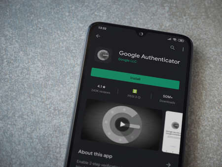 Lod, Israel - July 8, 2020: Google Authenticator app play store page on the display of a black mobile smartphone on ceramic stone background. Top view flat lay with copy space.