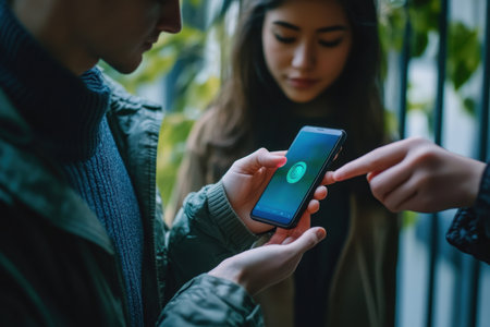 Two friends engage in a conversation about their smartphone, sharing insights in a twilight setting.