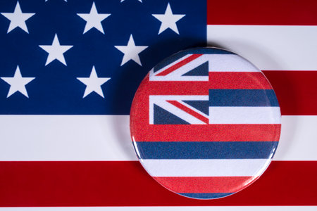 LONDON, UK - APRIL 27TH 2018: The symbol of the State of Hawaii, pictured over the flag of the United States of America, on 27th April 2018.