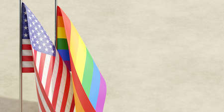 LGBT Gay pride and US America flags. LGBTQ community rights in United States. Rainbow color and USA flag on flagpoles, copy space. 3d render
