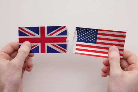 UK and USA paper flags ripped apart. political relationship concept