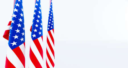 Independence day background. Veterans day. Greeting template with american flags on blue, copy space. Memorial day