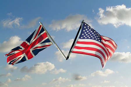 Stars and Stripes and Union Jack - US and UK national flags against the blue sky