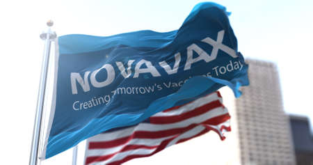 Gaithersburg, MD, USA, January 28, 2021: flag with the Novavax logo waving in the wind with the American flag in the background. Novavax announced development of a vaccine for prevention of COVID-19
